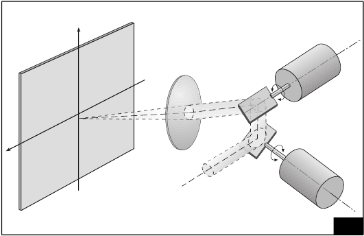 掃描頭的基本工作是在X-Y方向上偏轉光束并將光束聚焦在工作面上。借助于兩個偏轉鏡片實現(xiàn)光束偏轉,見圖1。光束通過輸入孔徑進入掃描頭,先由綁定在掃描電機1上的鏡片1實現(xiàn)Y方向反射,然后到達與掃描電機2綁定在一起的鏡片2上,實現(xiàn)X方向的偏轉。通過控制掃描電機的位置就能夠精確調(diào)整光束的偏轉角度。在掃描頭出光孔處安裝有掃描透鏡,借助它光束聚焦在工作平面上。如果使用F-θ物鏡,圖像域上焦點的位置就和光束的入射角成正比。